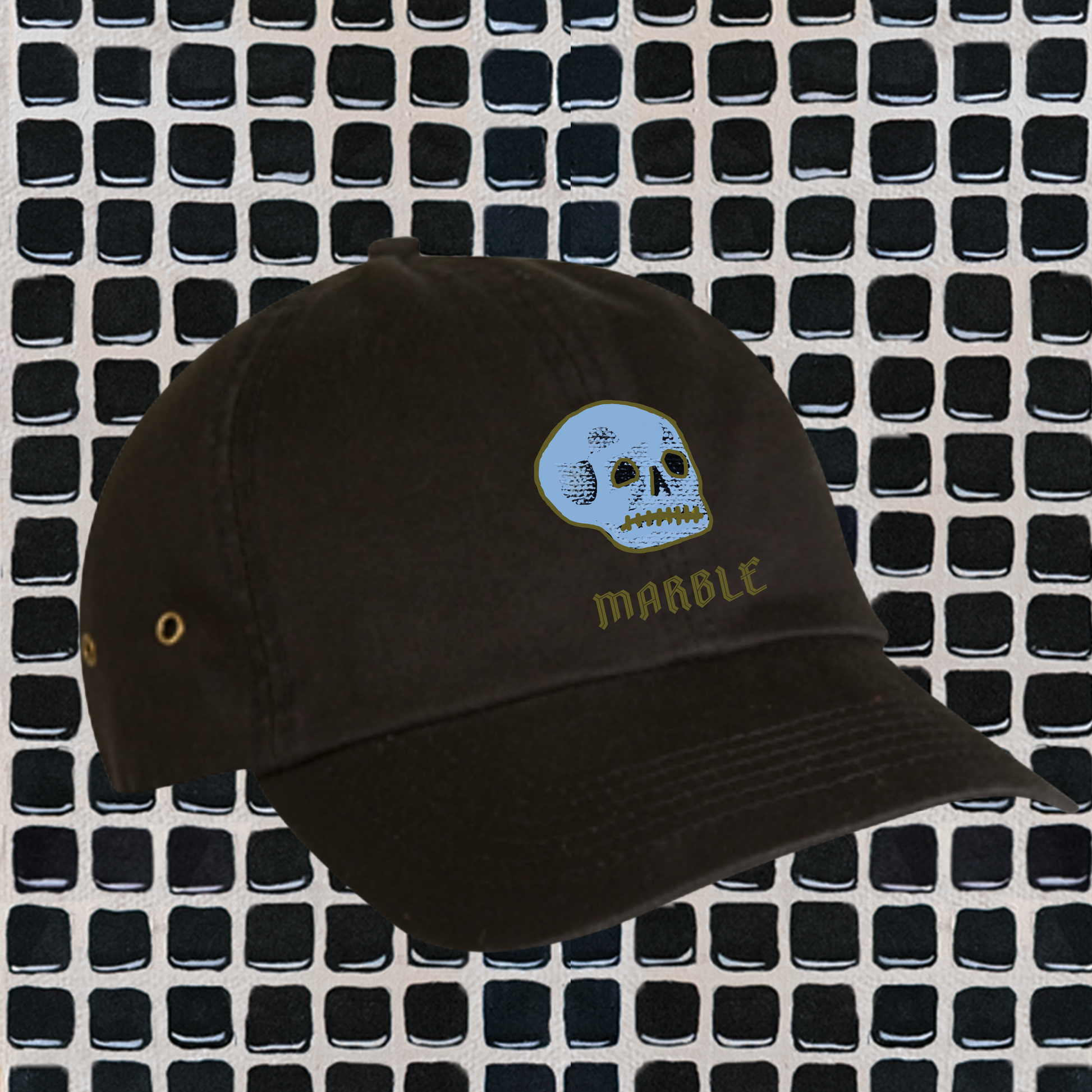 Laundered chino unstructured cap in black. Embroidered skull and "MARBLE" on front.